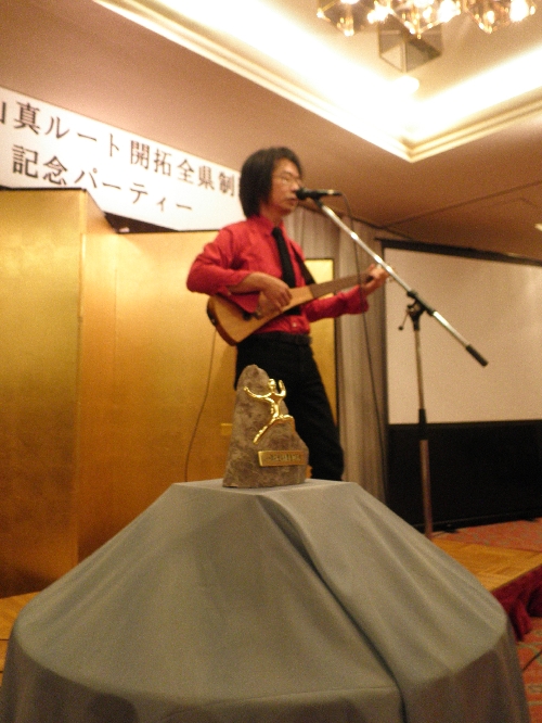 楽しかったパーティも閉会に近づいてきました。ステージ前にずっと飾られていたのは、クライマーの方が、自ら採取してきた岩を自分で削り、ドイツの家具の取っ手をつけ、ディズニーランド工房?で特注したプレートを張ったものだそうです(うろ覚えてすみません)。この盾と花束が拍手と共に北山さんに贈呈されました。